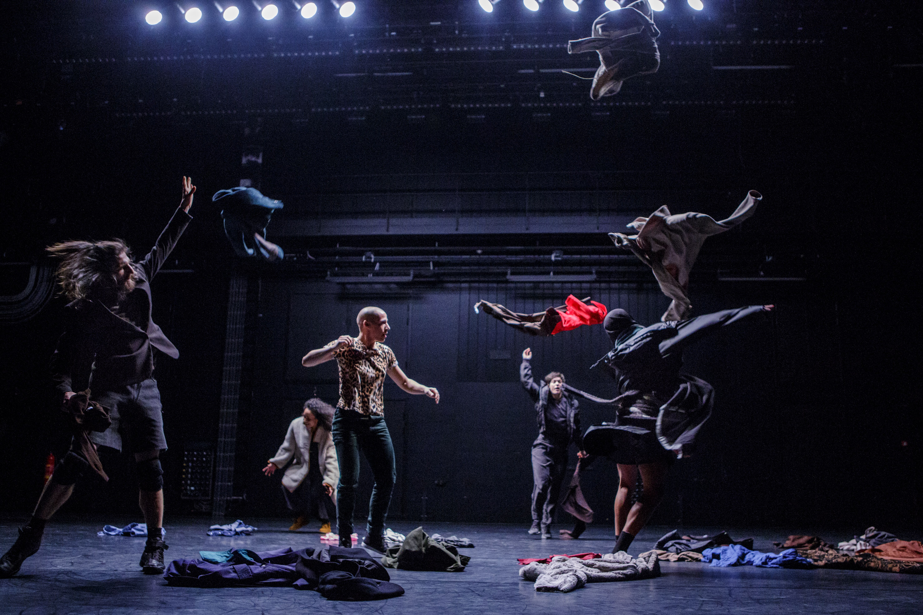 Désormais vêtus d’une superposition exubérante de costumes – pagnes et survêtements, manteaux noués sur les hanches et foulards entremêlés –, les danseurs font s’entrechoquer par des courses fuyantes des imaginaires disparates : des figures totémiques côtoient de possibles mannequins de prêt-à-porter, tandis qu’au centre une inquiétante silhouette marginale est dissimulée sous un amas d’habits dont les manches et les pans s’entremêlent et se soulèvent au rythme de sa course. Les vêtements un à un éjectés de cet amoncellement par la force centrifuge de sa course se gonflent d’air et épousent les silhouettes des corps qui les habitent en puissance.